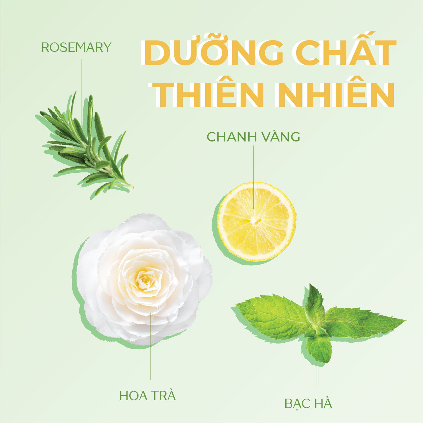Chiết xuất Bạc hà, Acid Citric, Rosemary, cùng Dầu hoa Trà Nhật, Sữa ong chúa, Protein đậu nành, không chứa Silicone, vừa giúp sạch dầu, giảm ngứa da đầu cùng cảm giác mát lạnh sảng khoái, vừa giúp tóc mềm mượt, phục hồi hư tổn