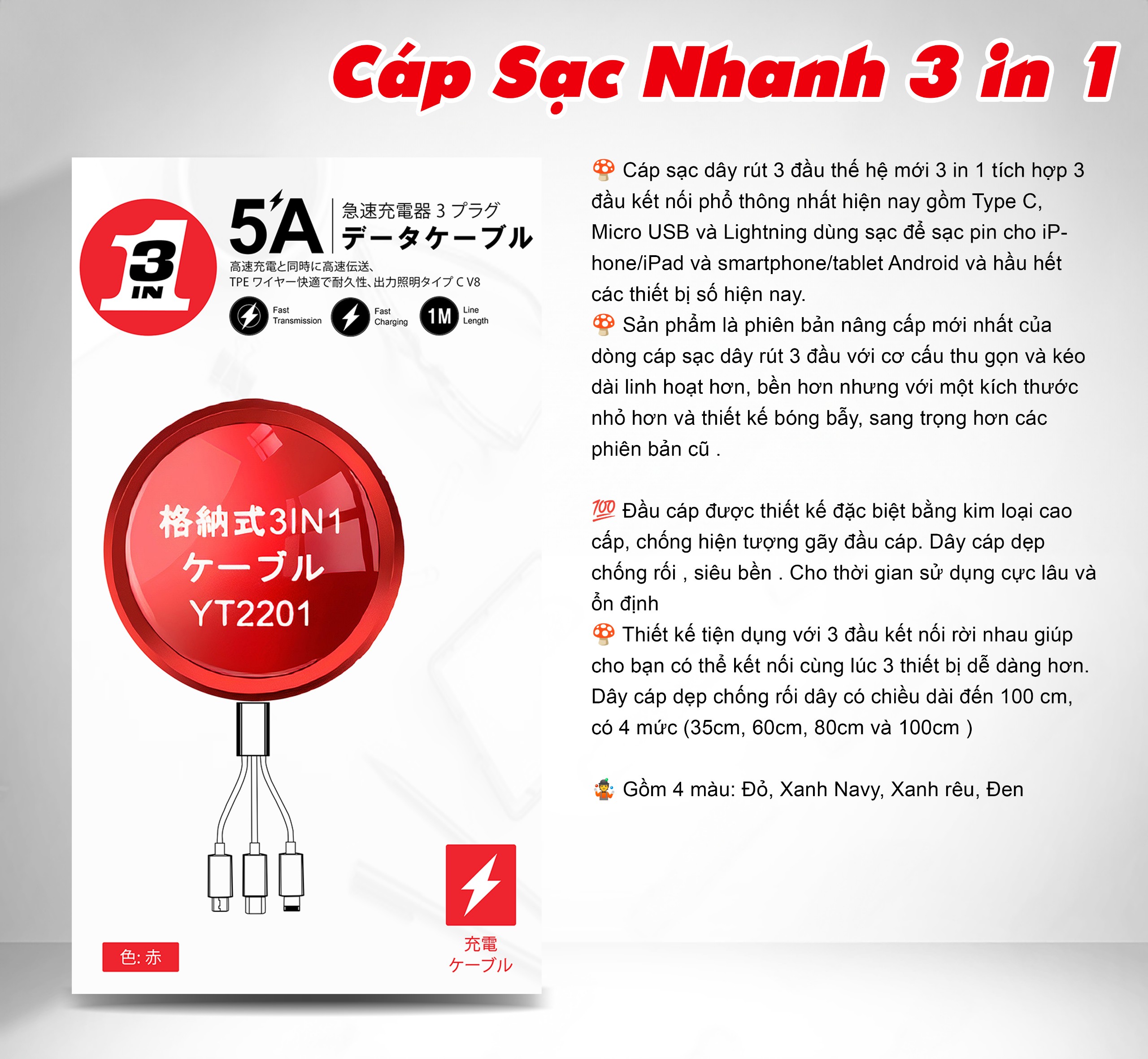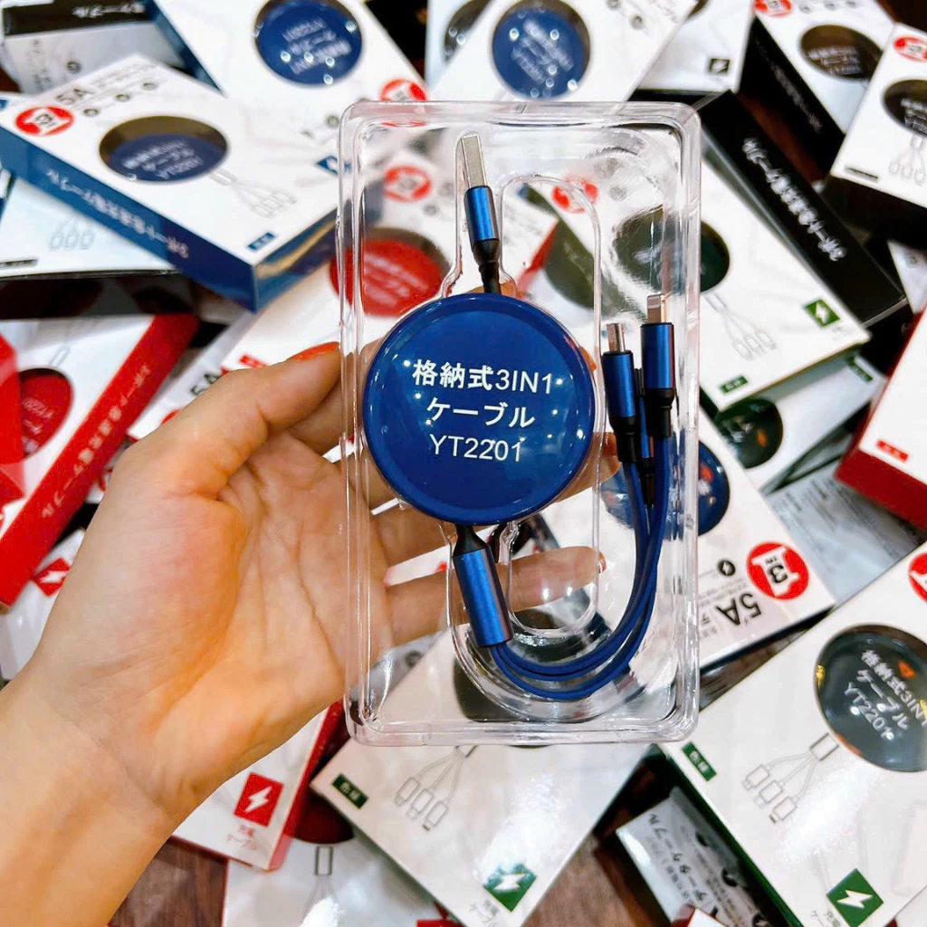 - Sản phẩm là phiên bản nâng cấp mới nhất của dòng cáp sạc dây rút 3 đầu với cơ cấu thu gọn và kéo dài linh hoạt hơn, bền hơn nhưng với một kích thước nhỏ hơn và thiết kế bóng bẫy, sang trọng hơn các phiên bản cũ .