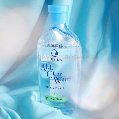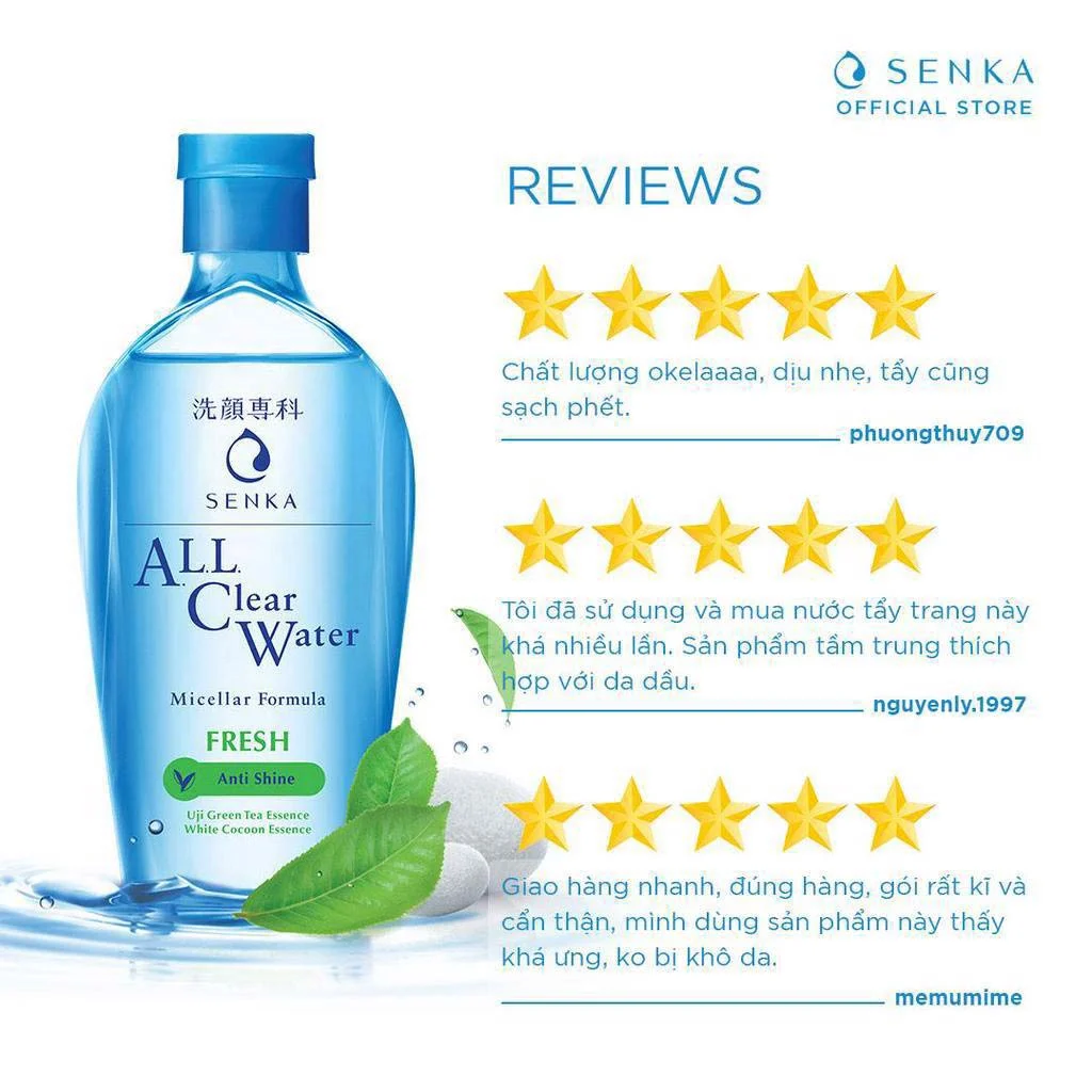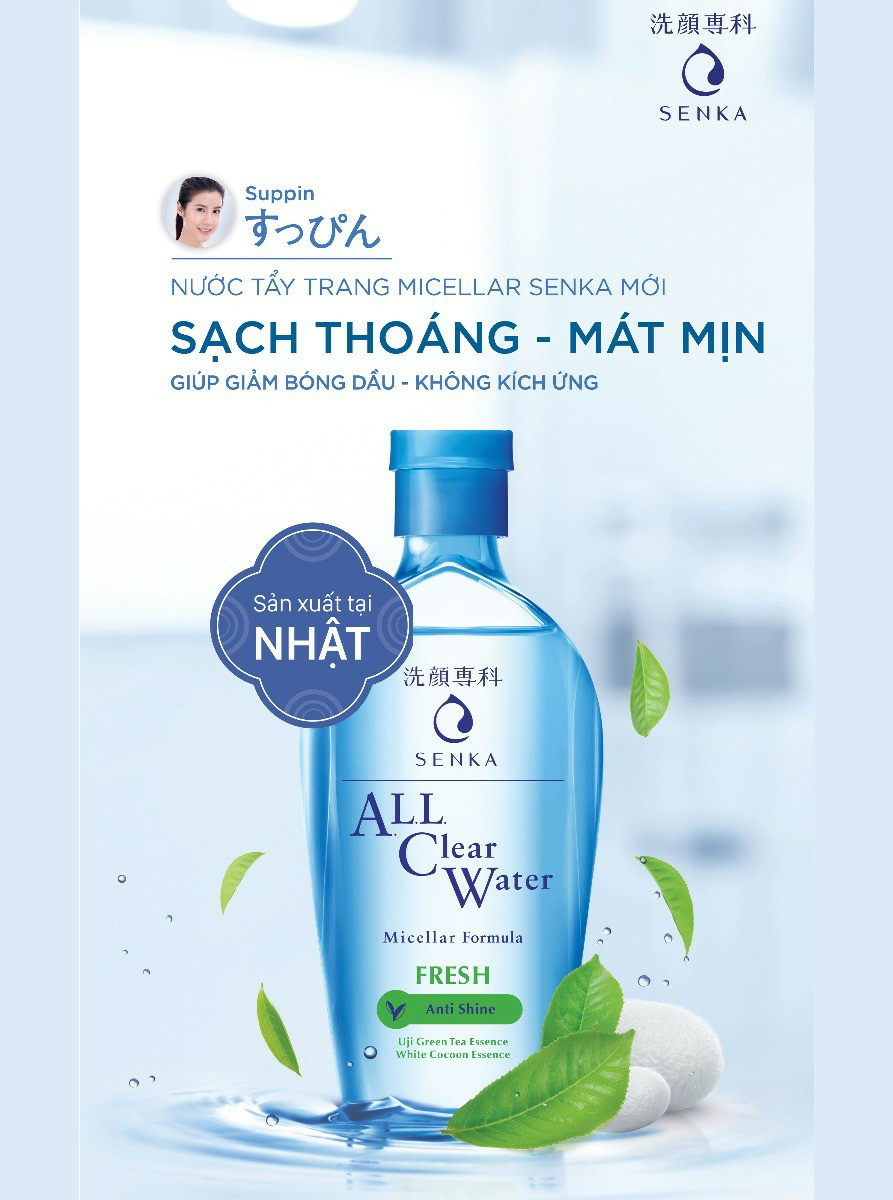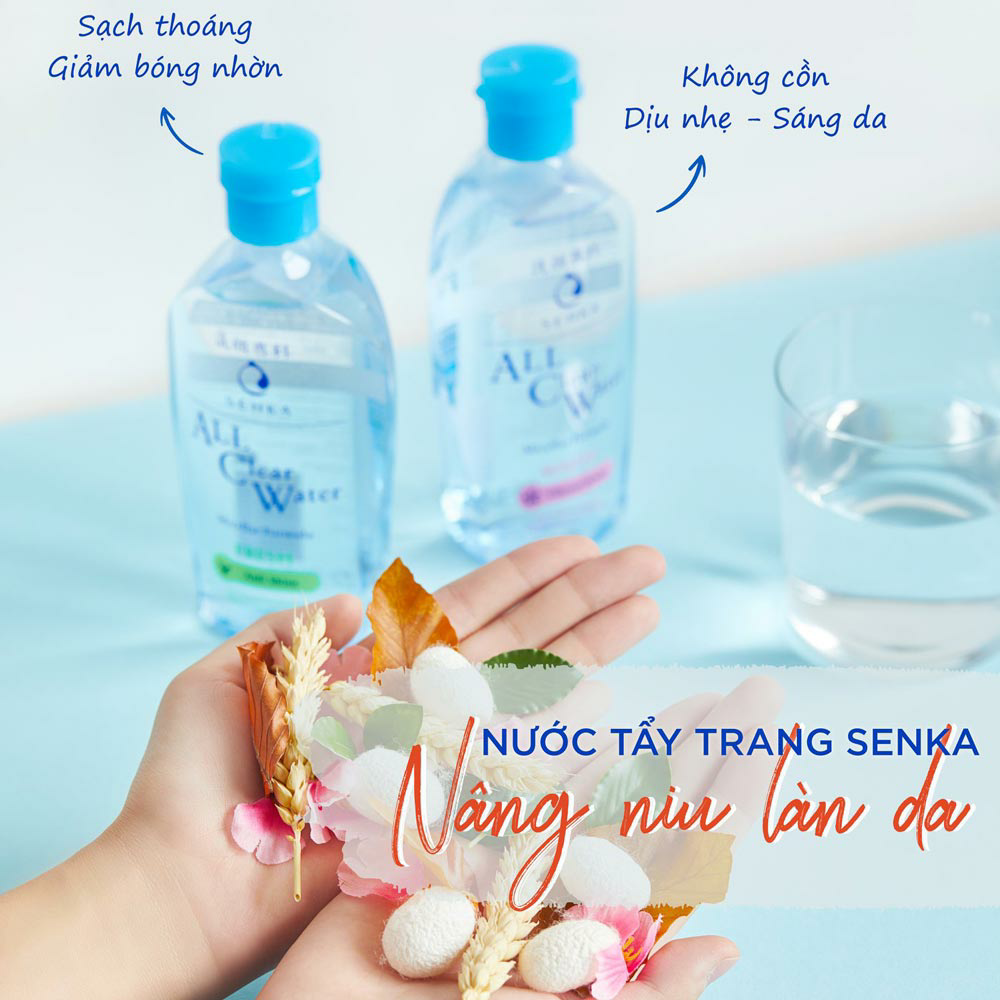 • Nước Tẩy Trang Senka All Clear Water Fresh Anti Shine (70ml; 230ml): làm sạch sâu da, hỗ trợ giảm mụn, kiểm soát nhờn.