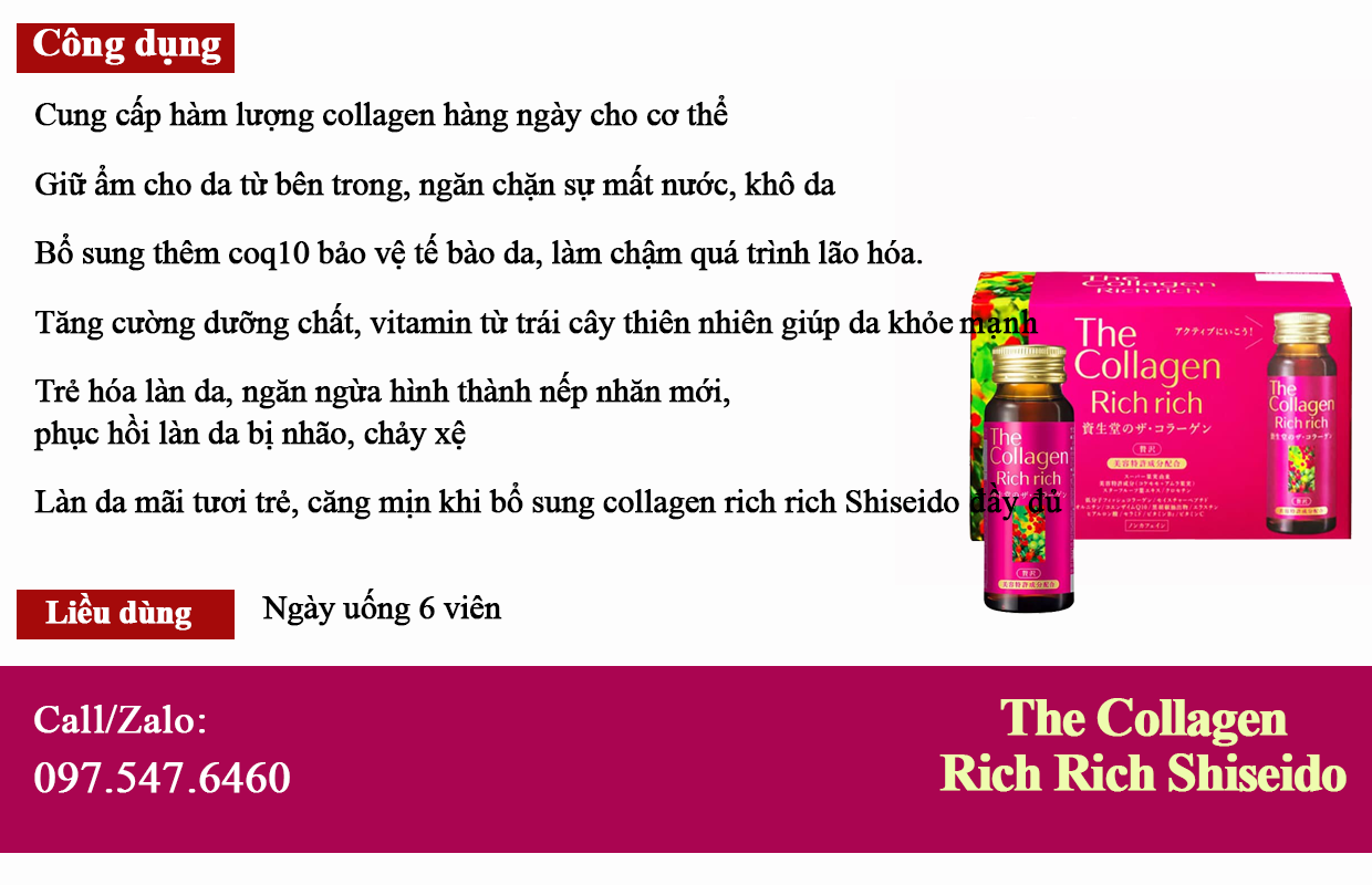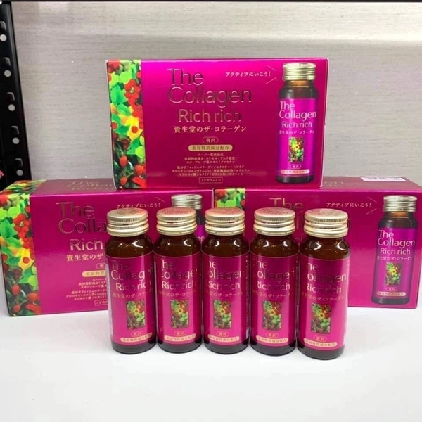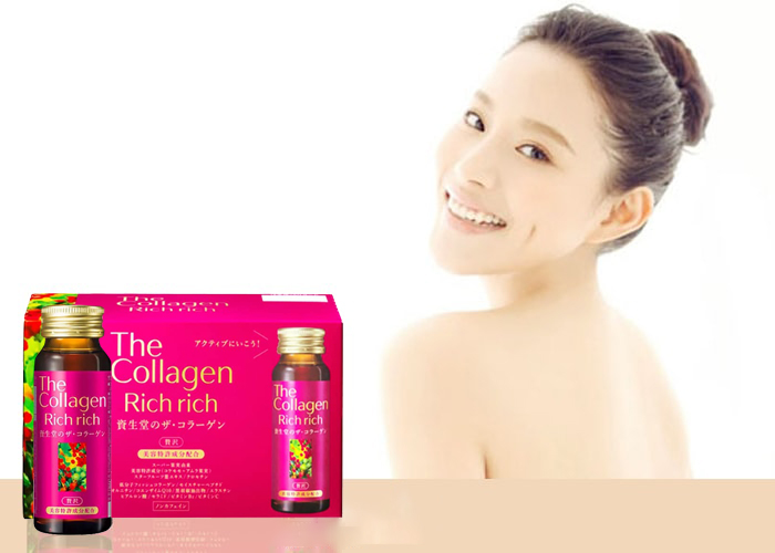 • The Collagen Rich Rich Shiseido là collagen được điều chế dạng nước uống cùng với một số dưỡng chất quý giá như Hyaluronic Acid và enzyme coQ10, Vitamin C giúp nuôi dưỡng làn da mịn màng, tươi trẻ, ngăn chặn nếp nhăn, chảy xệ, lão hóa. Sản phẩm này với liều lượng và hiệu quả cao rất thích hợp với phụ nữ ở độ tuổi sau 35, khi những dấu hiệu của lão hóa da đã biểu hiện rõ rệt.