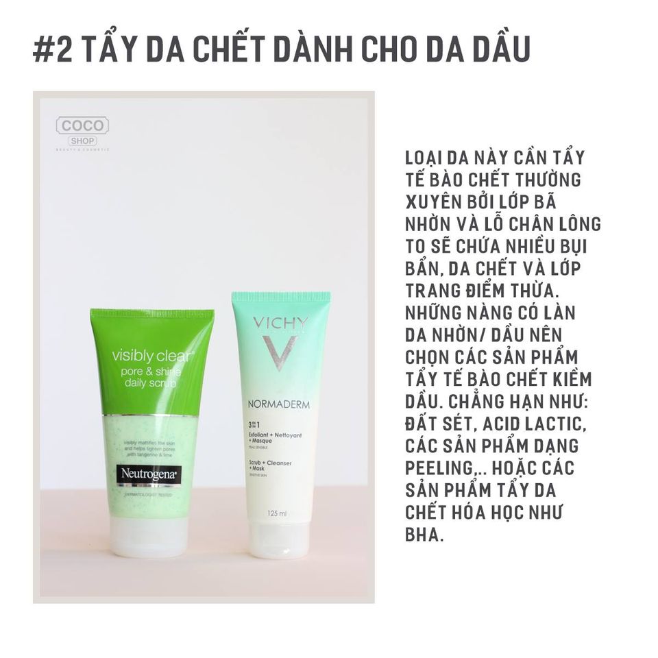 Loại da này cần tẩy tế bào chết thường xuyên bởi lớp bã nhờn và lỗ chân lông to sẽ chứa nhiều bụi bẩn, da chết và lớp trang điểm thừa. Những nàng có làn da nhờn/ dầu nên chọn các sản phẩm tẩy tế bào chết kiềm dầu. Chẳng hạn như: đất sét, acid lactic, các sản phẩm dạng peeling,.. hoặc các sản phẩm tẩy da chết hóa học như BHA.