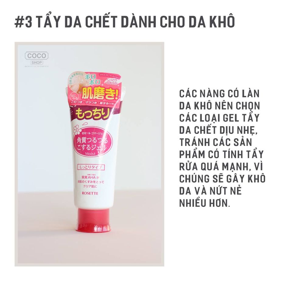 Các nàng có làn da khô nên chọn các loại gel tẩy da chết dịu nhẹ, tránh các sản phẩm có tính tẩy rửa quá mạnh, vì chúng sẽ gây khô da và nứt nẻ nhiều hơn.